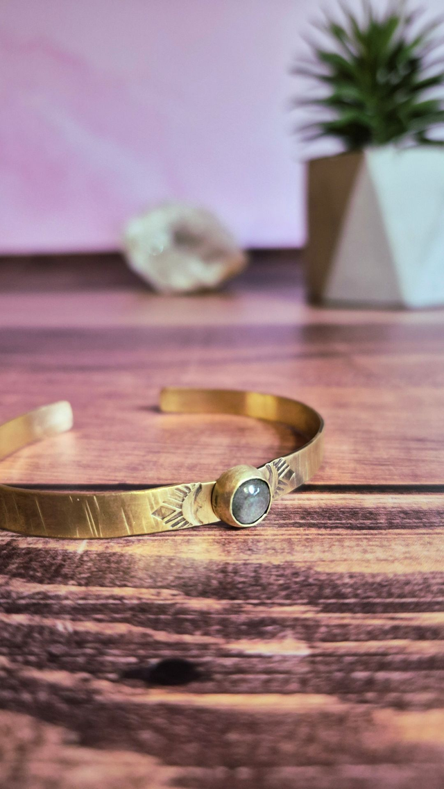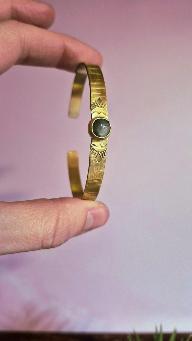 Ce bracelet en laiton martelé de 6 mm de large est décoré de motifs poinçonnés qui apportent une texture discrète. Une pierre naturelle, placée au centre, ajoute une touche de lumière. Sa forme ajustable permet de l’adapter facilement à ton poignet. Confortable à porter, il se porte aussi bien seul qu’en accumulation avec d’autres bracelets.
